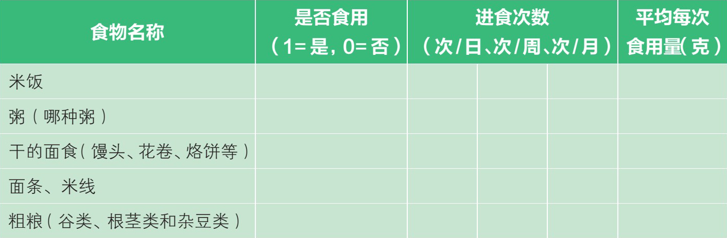 3. 在询问频率时先问每天吃几次;如果不是,立即转问每周吃几次;如果还不是,立即转问每月吃几次;如果一个月平均不到一次,算作0。把频率与一次平均摄入量相乘,再除以相应天数(频率按周计算则除以7,按月计算则除以30),以核算出每天摄入量。