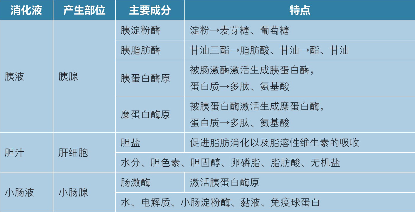 经胃消化后的食物进入小肠,在胰液、胆汁、小肠液和小肠运动的作用下继续消化,基本完成食物的消化和吸收过程。小肠中消化液的产生部位、主要成分及特点见表1-7。
