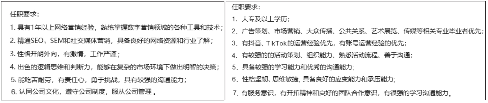 图1-6 智联招聘和BOSS直聘上不同公司关于网络营销岗位的任职要求