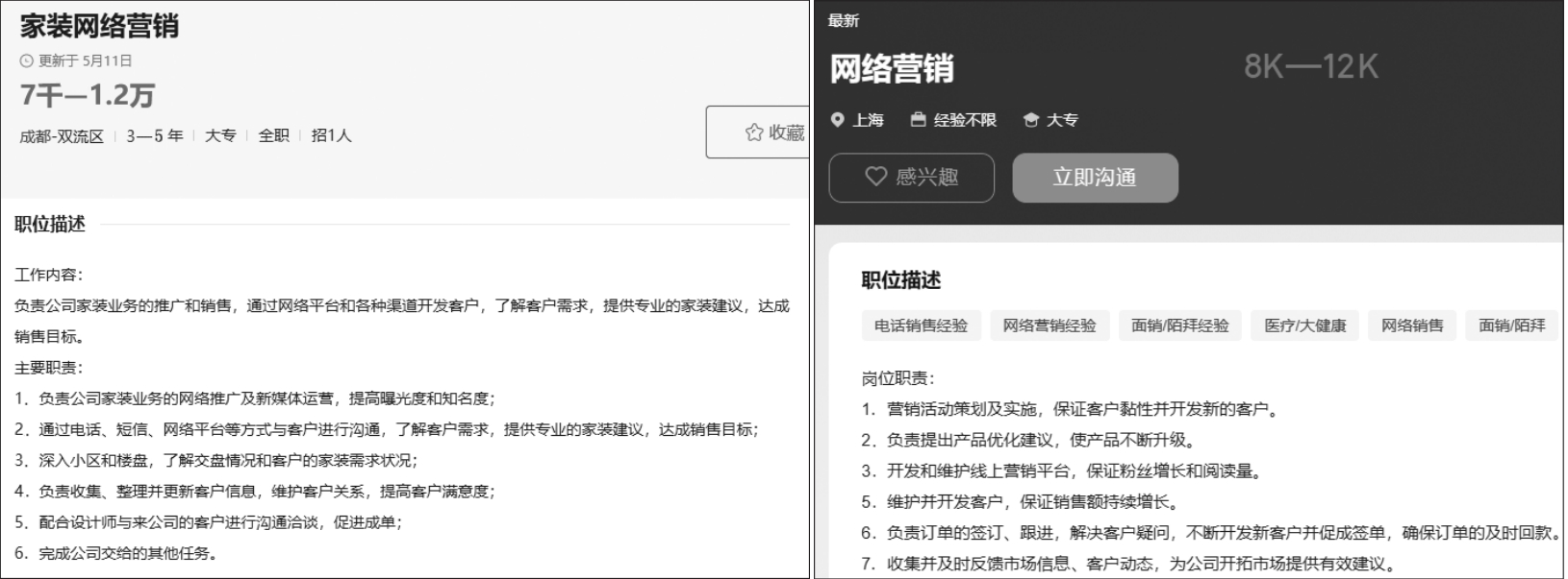 图1-5 智联招聘和BOSS直聘上不同公司对网络营销岗位的工作职责的描述