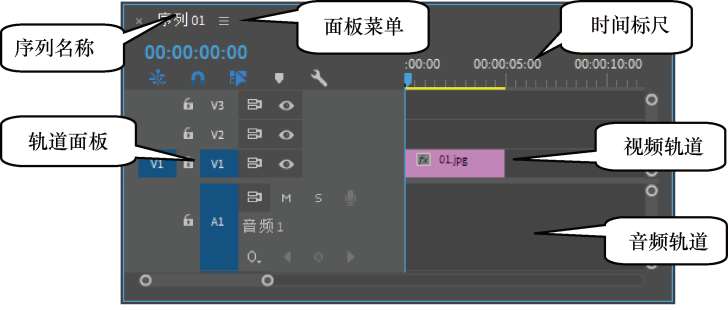 “时间轴”面板是Premiere Pro 2020的核心部分之一。在编辑影片的过程中,大部分工作都是在“时间轴”面板中完成的。通过“时间轴”面板,用户可以轻松地对素材进行剪辑、插入、复制、粘贴、修整等操作,“时间轴”面板如图1-3所示。