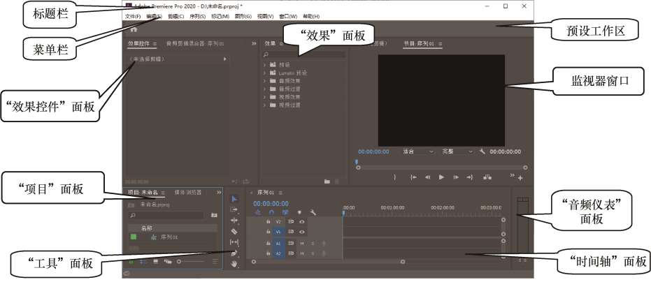 Premiere Pro 2020的操作界面如图1-1所示。从图中可以看出,Premiere Pro 2020的操作界面由标题栏、菜单栏、“效果”面板、“时间轴”面板、“工具”面板、预设工作区、监视器窗口、“项目”面板等组成。