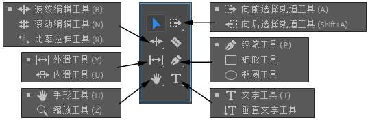 “工具”面板中包含一系列工具,这些工具主要用来对“时间轴”面板轨道中的音频、视频等内容进行编辑,如图1-15所示。