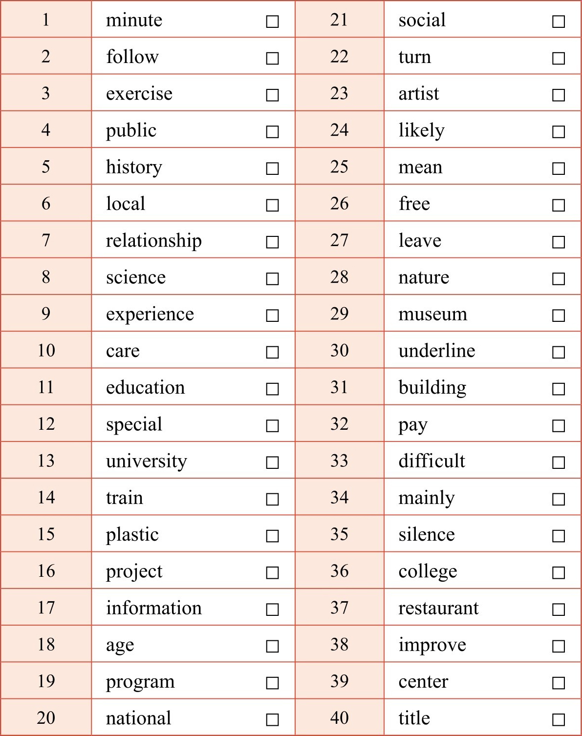 短时记忆词转化为长时记忆词。 在每一阶段结束时将所有荧光笔标注词汇再次读过,并依据每隔6天的频率重复记忆,也就是第7天、第14天、第21 天重复读熟荧光笔标注的词,将短时记忆词转化为长时记忆词。