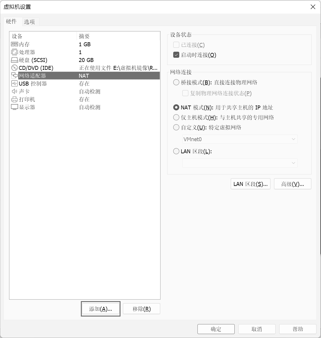 ·LAN区段:这是新版VMware新增的功能,类似于交换机中的VLAN(虚拟局域网),可以在多台虚拟机中划分不同的虚拟网络。