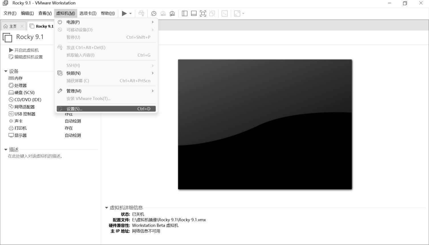 注意: 这个“设置”选项是每个虚拟机镜像独立的,也就是说我们目前的设置只针对Rocky 9.1这个镜像生效,与其他镜像无关。点击之后,我们进入“虚拟机设置”界面,如图2-10所示。