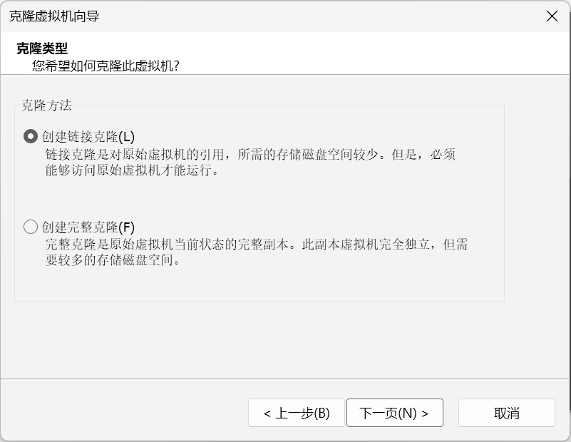 具体使用哪种克隆类型,效果区别不大,笔者建议使用“链接克隆”,这样更节省硬盘空间,只是要记住不能删除原始虚拟机镜像。