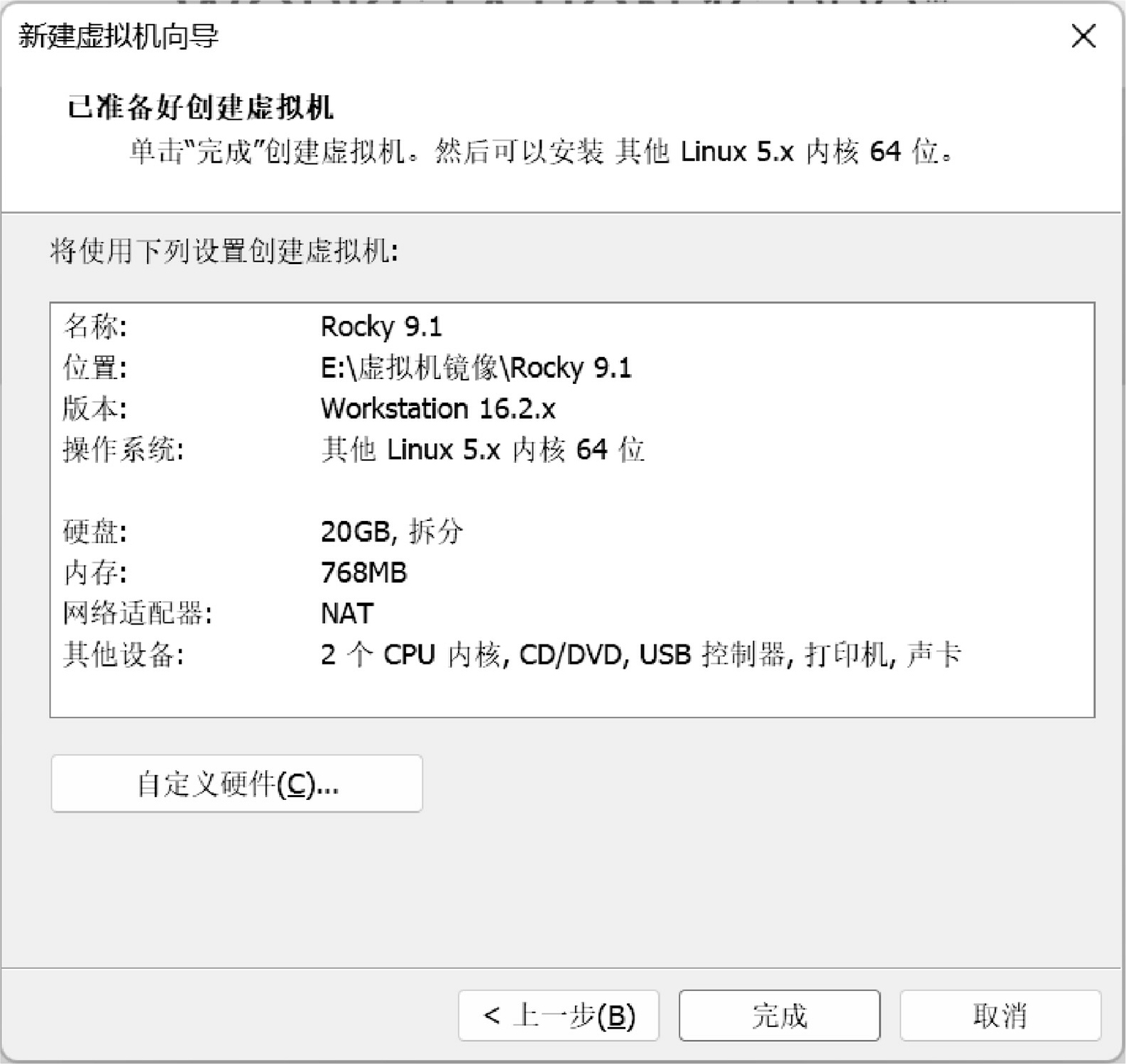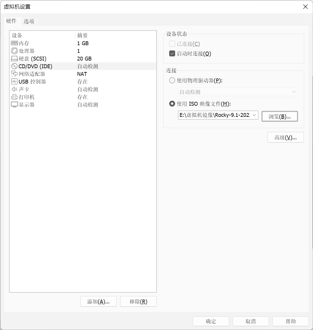 注意: 这个“设置”选项是每个虚拟机镜像独立的,也就是说我们目前的设置只针对Rocky 9.1这个镜像生效,与其他镜像无关。点击之后,我们进入“虚拟机设置”界面,如图2-10所示。
