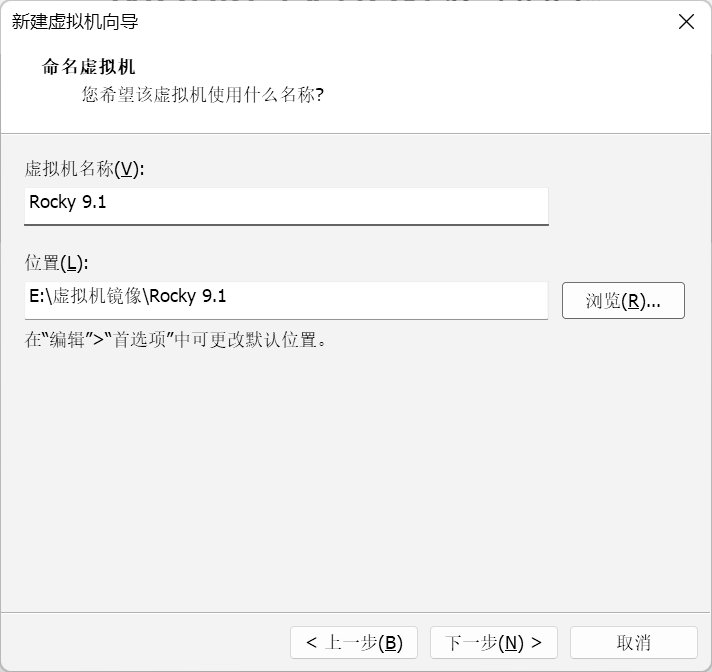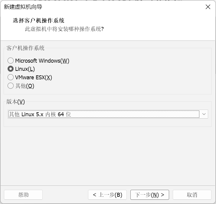 这里选择要安装的操作系统,我们选择“Linux”。在版本框中,下拉选择“其他Linux 5.x内核64位”。目前,Rocky Linux 9对虚拟机来讲太新了,无法找到对应的版本。其实这里选择任何一个64位操作系统版本都是可以的,不影响后续使用。点击“下一步”按钮,进入“命名虚拟机”界面,如图2-5所示。
