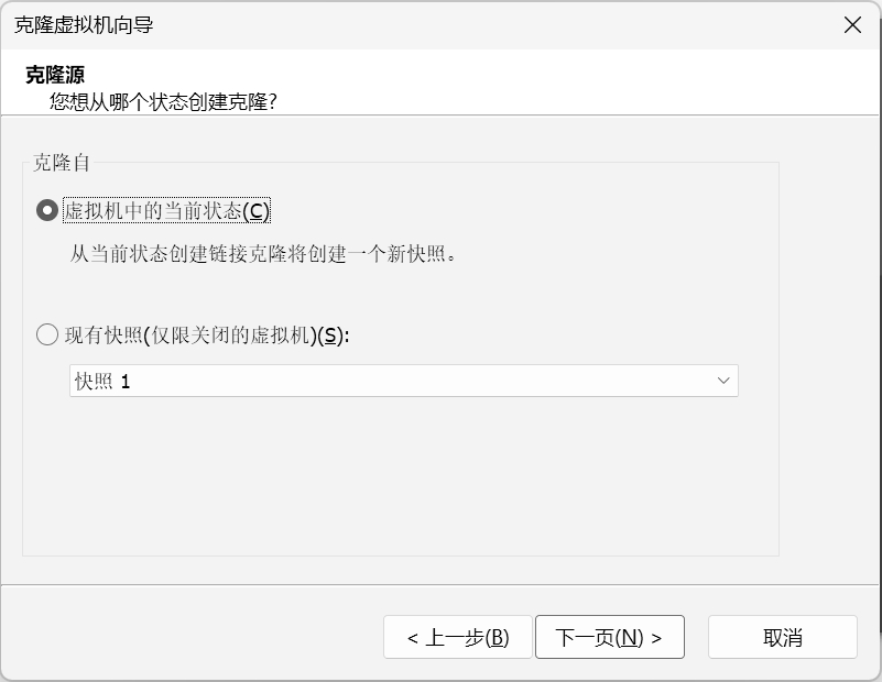 我们会看到“克隆源”界面,这里可以选择是从虚拟机当前状态克隆新虚拟机,还是从指定的快照克隆新虚拟机,这里按照大家的需要自行选择,笔者这里选择“虚拟机中的当前状态”克隆,点击“下一步”按钮,如图2-22所示。