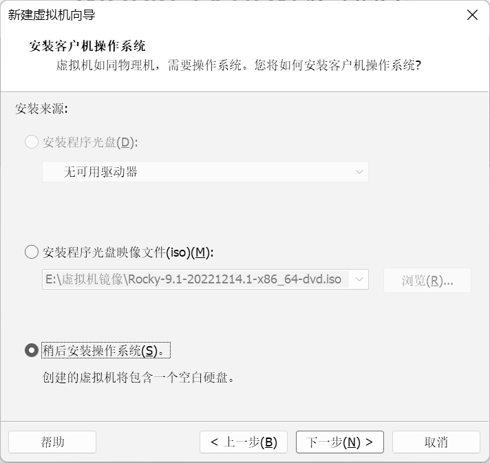 在这个界面,我们需要选择采用什么安装来源来安装客户机操作系统呢?因为目前我们的计算机已经基本淘汰了光驱,所以第一个选项“安装程序光盘”已经不能选择。