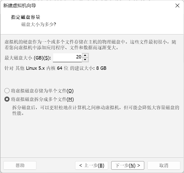这里指定的是虚拟机的硬盘大小,因为没有选定具体的Linux版本,默认大小只有8GB,建议修改为20GB。虚拟机的硬盘需要占用真实机的实际硬盘,但不会马上从硬盘划走20GB的空间,而是实际占用多大空间,就从真实硬盘划走多大空间,最大不超过20GB。