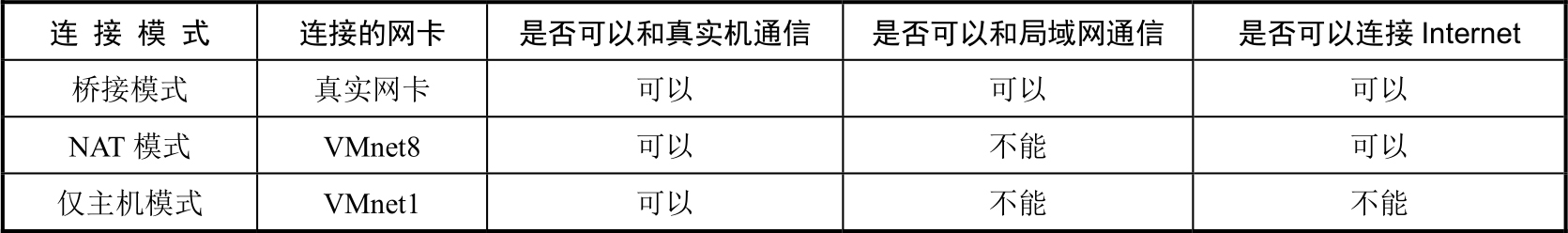 其实虚拟机网络连接模式真正起作用的连接方式是“桥接模式”“NAT模式”和“仅主机模式”。三种模式的区别如表2-1所示。
