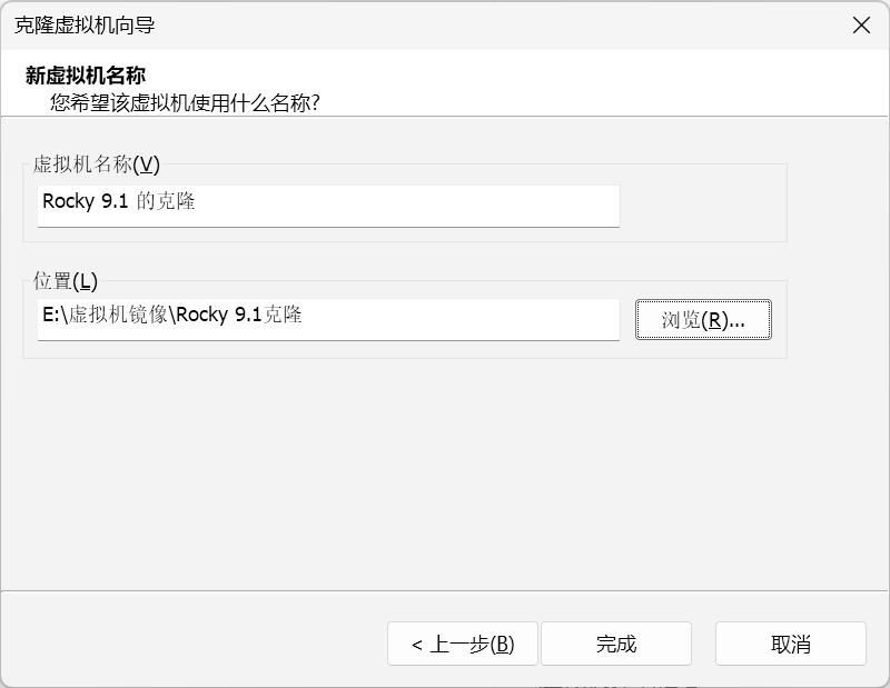 在此界面给克隆的新虚拟机起个名字,并选择保存位置,点击“完成”按钮,新虚拟机就克隆完成了。