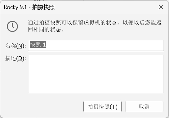 在这里给你的快照起一个可以区分的名字,默认是“快照1”,接着点击“拍摄快照”按钮,就可以把虚拟机当前状态保存在“快照1”当中。