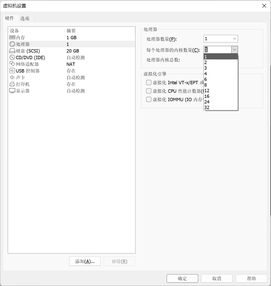 在这个页面调整的就是向虚拟机中导入CPU的个数和内核数量,调整这个参数,会提升虚拟机的CPU性能,但是会降低真实机的CPU性能。如果没有特殊需要,不要调整这个参数,“处理器数量”和“每个处理器的内核数量”两个位置都选择“1”。