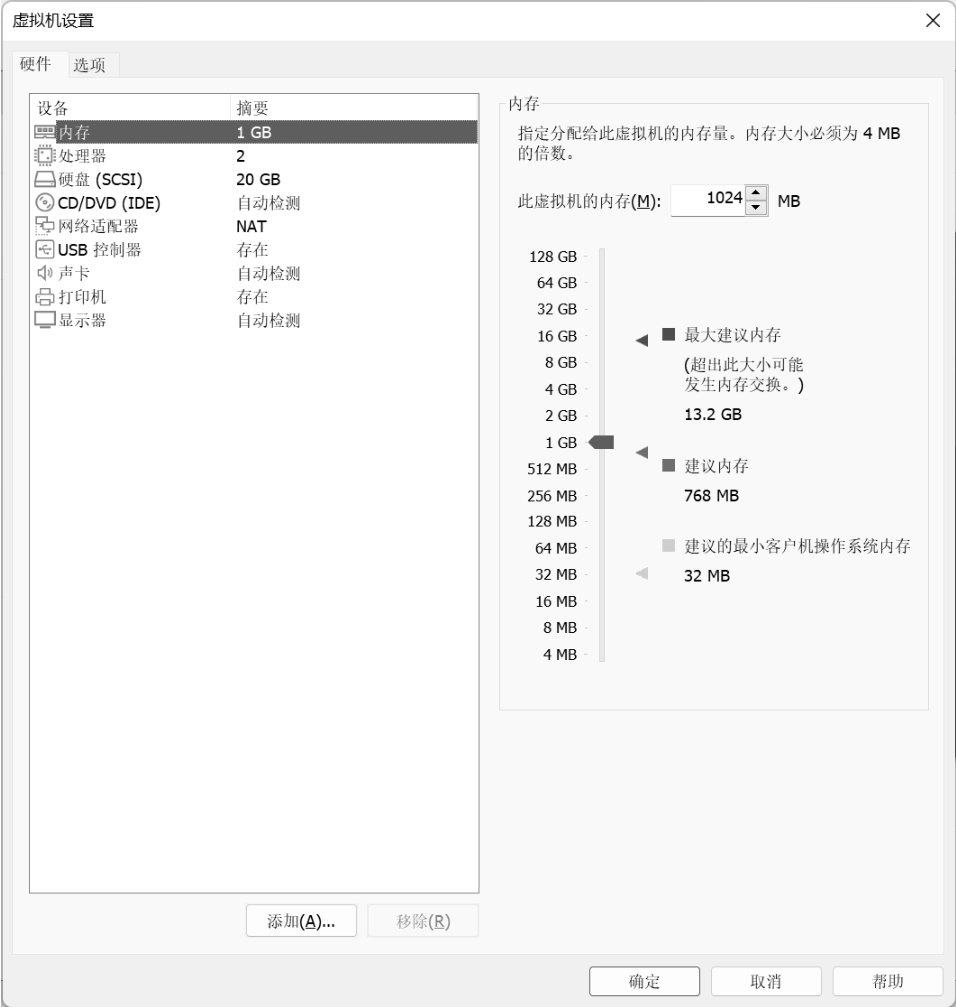 首先,调整第一个设备选项,即内存。笔者的真实机内存是16GB,因此能够给虚拟机分配的最大内存为13.2GB,真实机还需要预留一部分内存供自己使用。我们当然不能真的给虚拟机分配13.2GB的内存,如果这样,虚拟机的性能会非常好,但是真实机的性能消耗巨大,会非常卡顿,不建议这样修改。