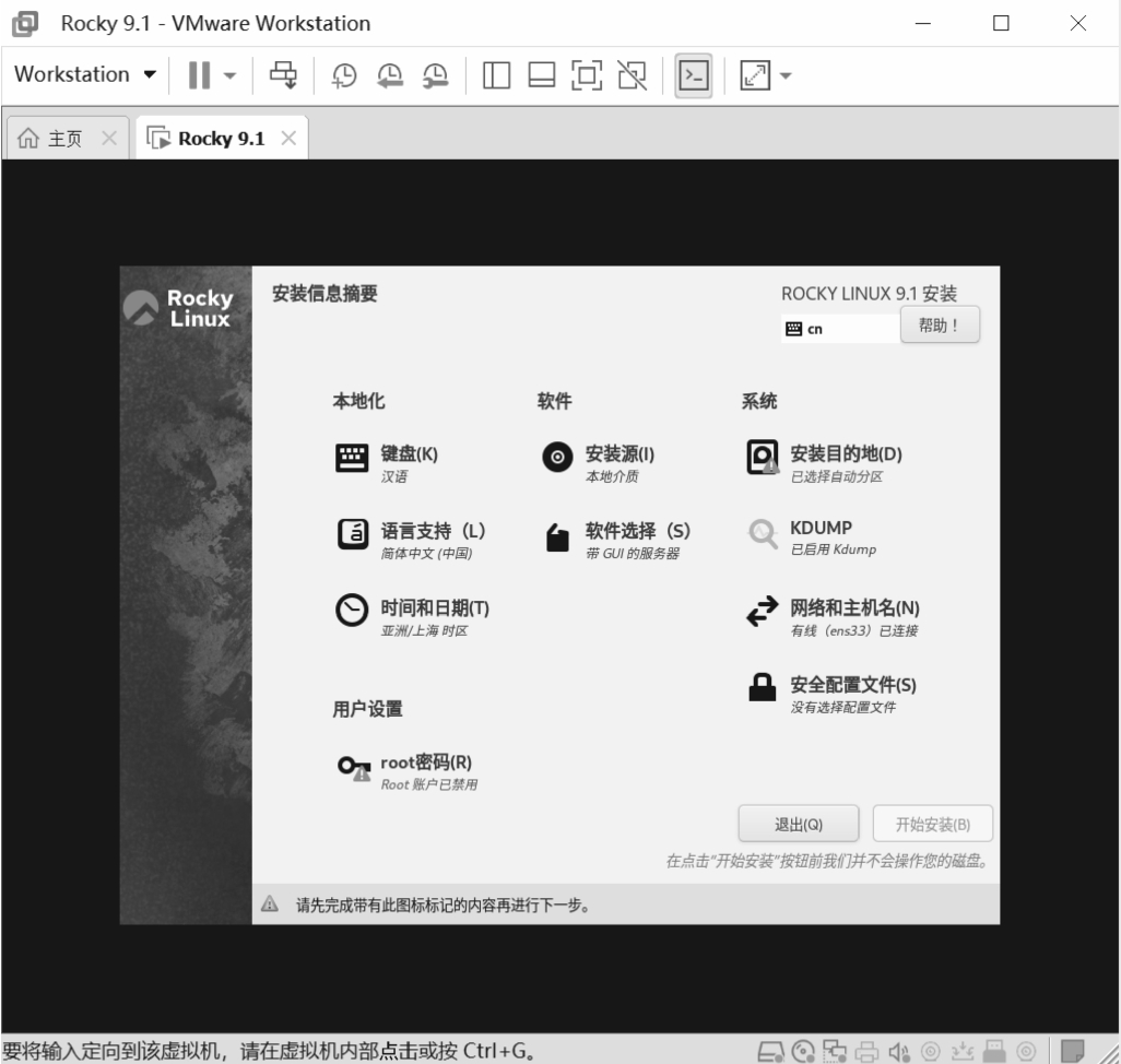 接下来,我们会看到安装信息摘要界面,Rocky Linux 9.x的安装信息摘要界面,沿用了CentOS 7.x的风格,所有信息都在同一个界面中配置,如图2-42所示。