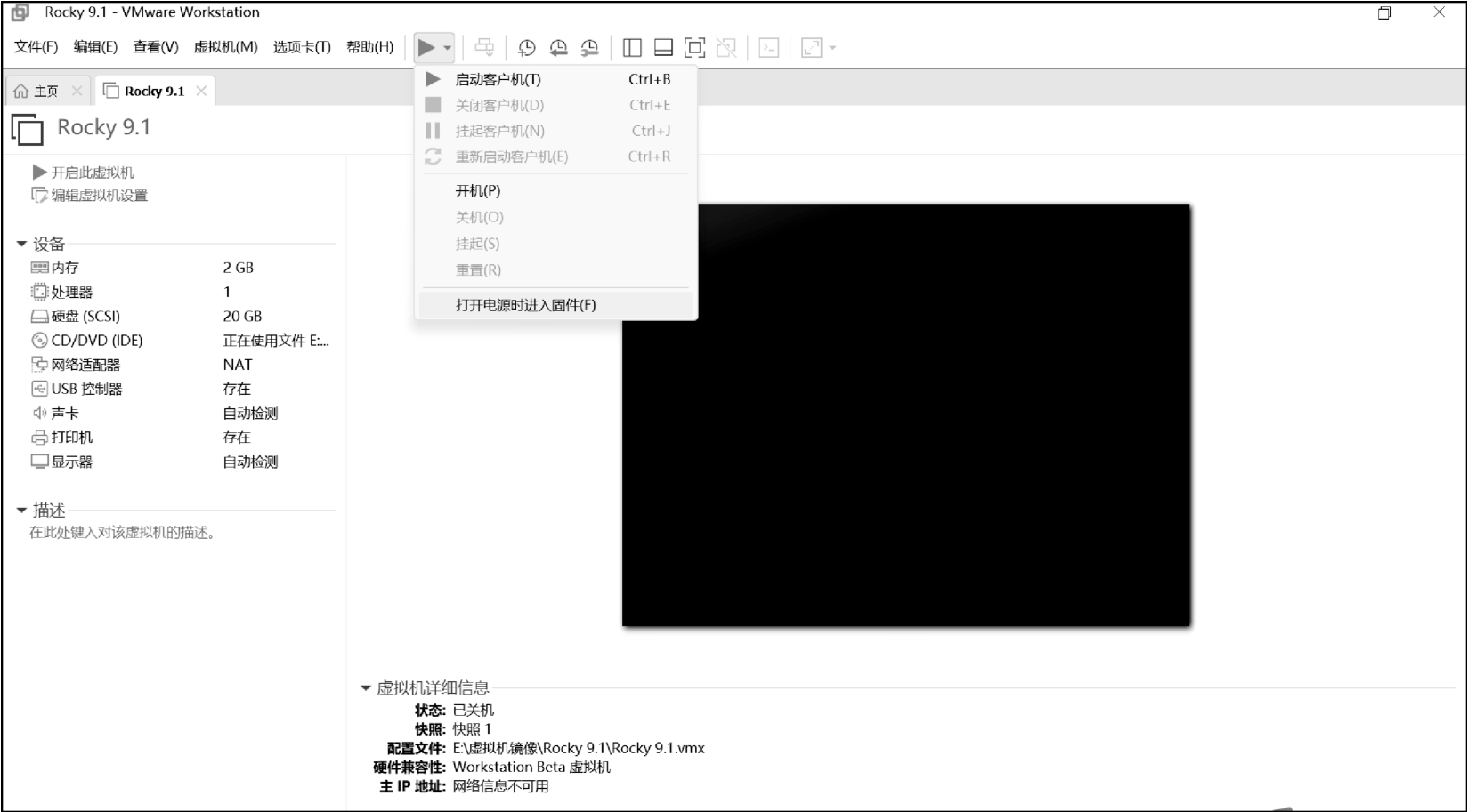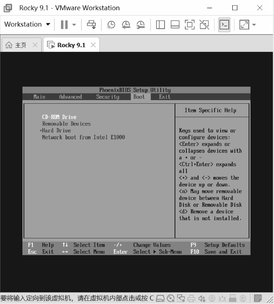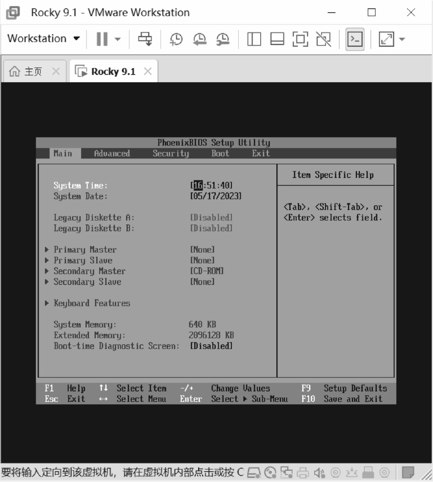 按照我们在2.1节中所学的方式,把下载好的Rocky Linux 9.x的镜像放入虚拟机的光驱中;然后点击“开启此虚拟机”按钮启动虚拟机,在启动界面按F2键,进入虚拟机的BIOS设置( 注意: 要把鼠标点入虚拟机后,再按F2键 )。