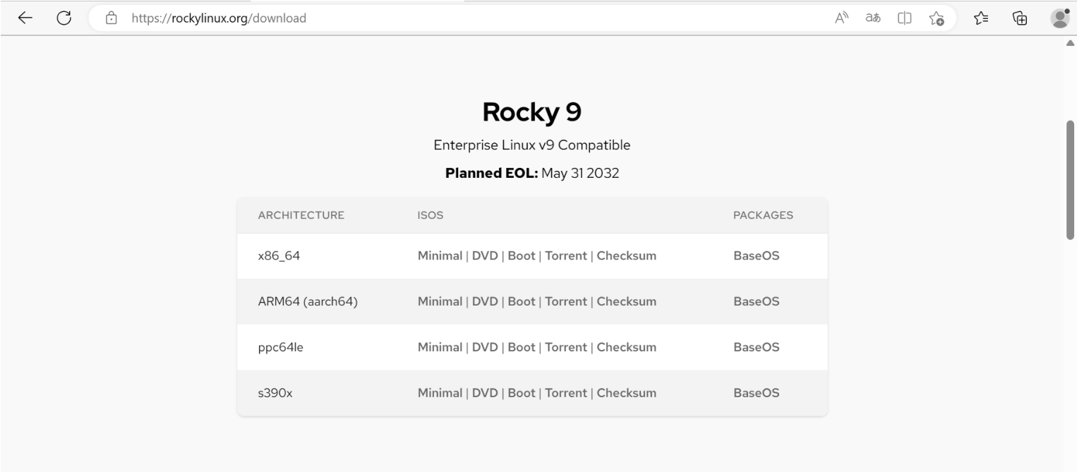 大家可以在Rocky Linux官网下载Rocky Linux 9.x的镜像。官网提供不同的版本可以选择下载,如图2-35所示。