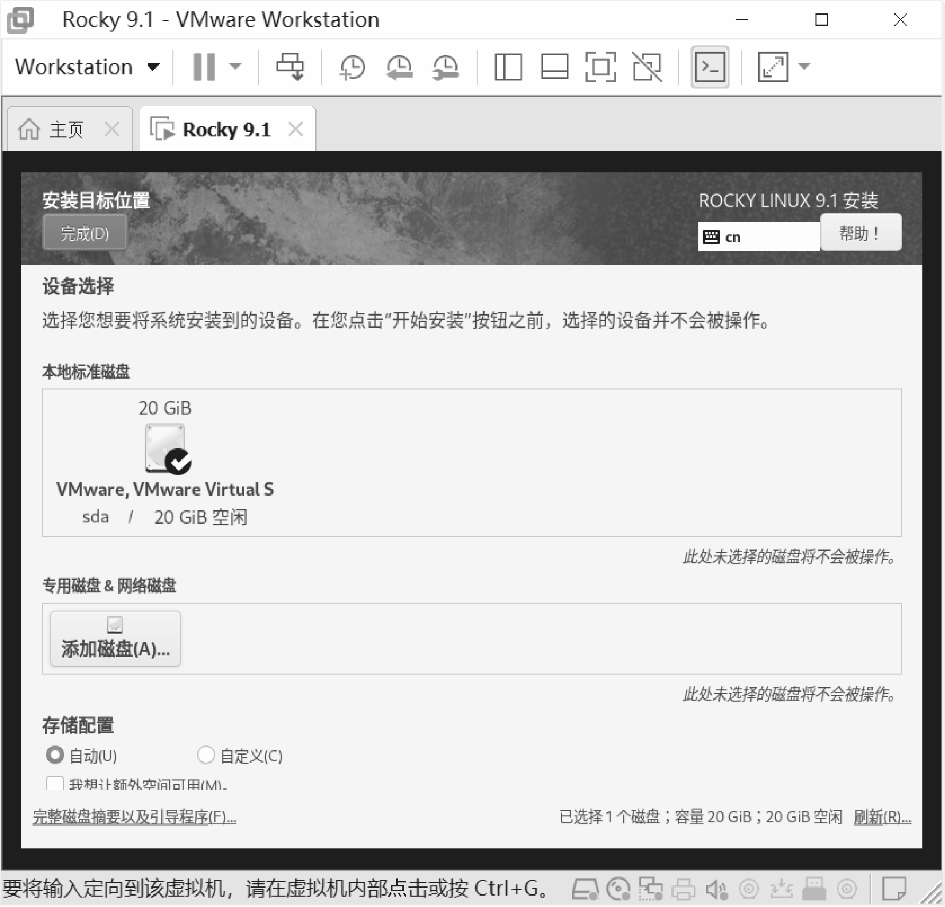 这个界面其实就是Linux系统的分区界面,如果大家什么配置都不修改,直接点击“完成”按钮也可以完成系统分区过程。但是,自动分区采用的是“LVM”分区方式,而LVM需要等到后续章节才能学习,目前我们还是采用手动分区。