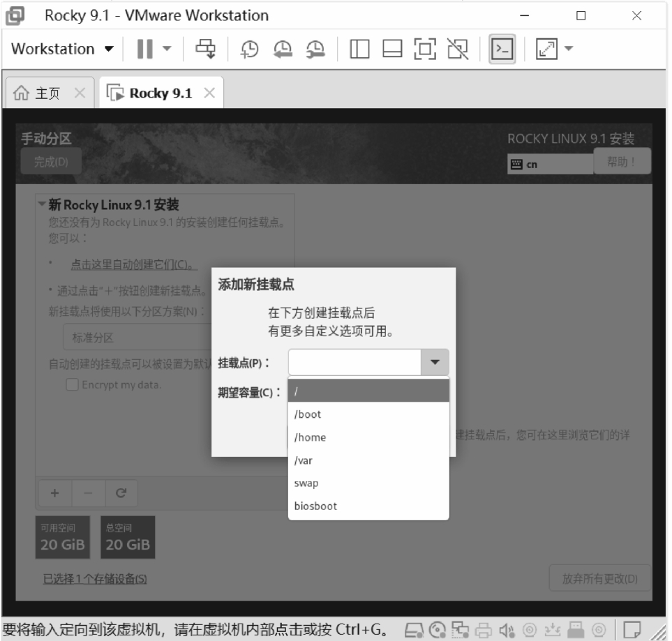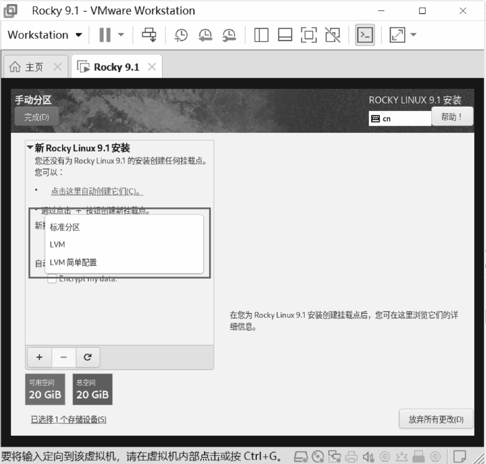 在“手动分区”界面,我们点击“分区方案”(方框标识位置),可以看到Rocky Linux 9.x支持:标准分区、LVM、LVM简单配置三个选项,我们选择“标准分区”。选择之后,也可以点击“点击这里自动创建它们”,进行自动分区。