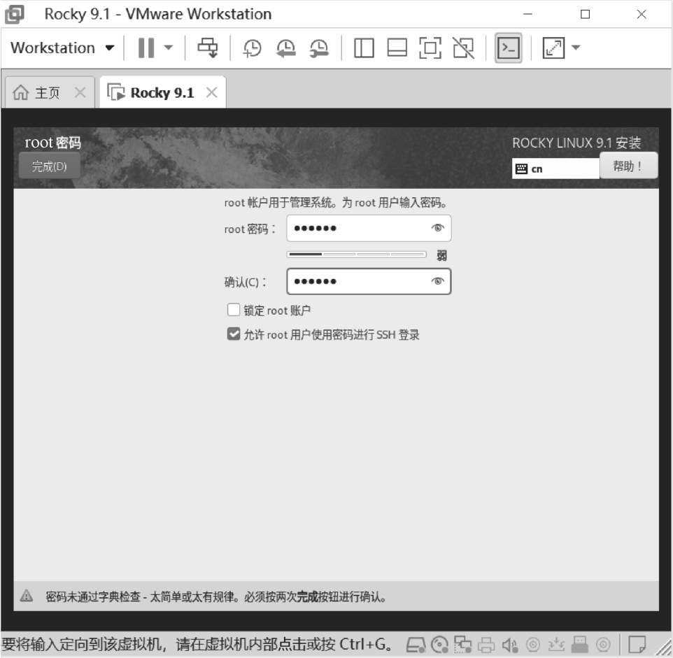 Linux的管理员账户是“root”,这个选项用于给root用户设置密码。如果勾选“锁定root账户”,则默认root账户被锁定,不能使用,当然也不需要设置密码。建议不要锁定root用户,我们学习Linux使用的时候,需要使用root用户权限。勾选“允许root用户使用密码进行SSH登录”,则会允许root用户远程登录,否则不允许。