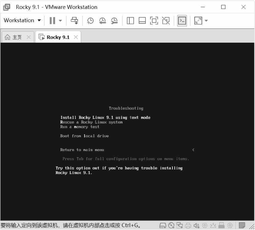 ·Install Rocky Linux 9. x using text mode:使用字符界面模式安装Rocky Linux 9.x。如果用这个选项安装,则会采用纯字符模式安装,这样会使安装难度大幅提升。不推荐采用此模式安装Linux(如果虚拟机内存小于768MB,会自动进入字符界面模式)。
