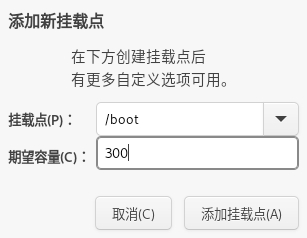 笔者给/boot分区指定了300MB的大小,如果不写单位,默认单位就是MB。如果不写大小,就是把所有剩余空间都分配给指定分区。点击“添加新挂载点”,/boot分区就建立好了。按照这个方法,接着分好“swap分区”和“根分区”就可以了,如图2-49所示。