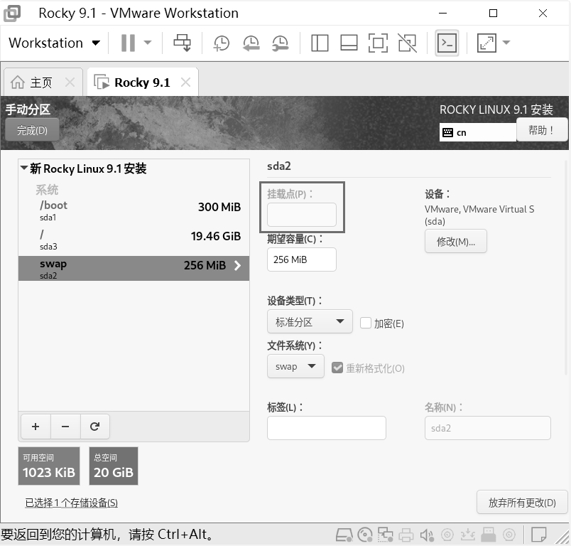 这里注意一下“swap分区”是没有挂载点的(方框标注位置),因为虚拟内存是直接给系统内核调用的,不需要用户直接访问,所以不需要挂载点。