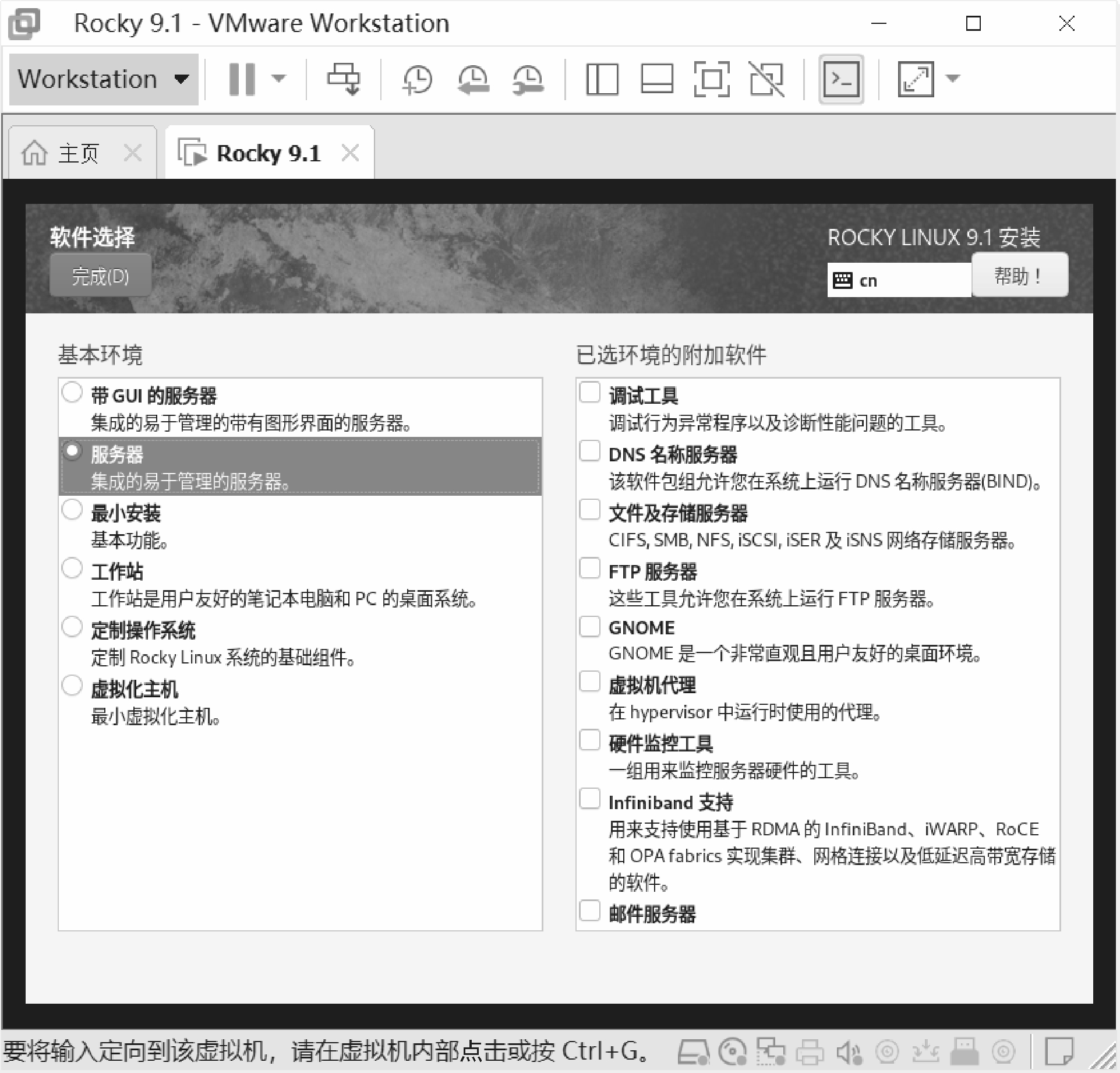 ·服务器:适合服务器管理的软件安装,此选项没有图形界面,是纯字符界面,但是常用命令和软件都已经安装完成。