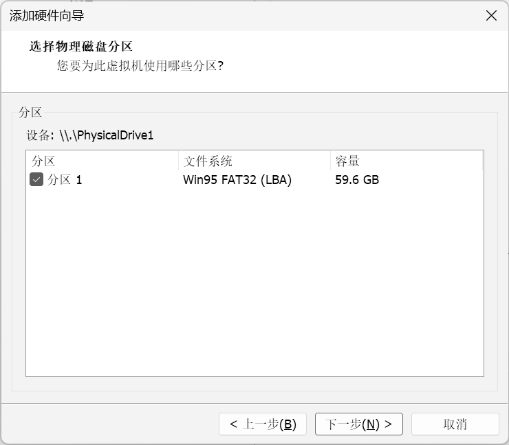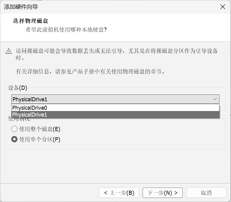 在这个界面中会发现,虚拟机把物理磁盘描述为“PhysicalDrive0”和“PhysicalDrive1”,这很难确认哪个是U盘。可以选择下面的“使用单个分区”,点击“下一步”按钮,如图2-61所示。