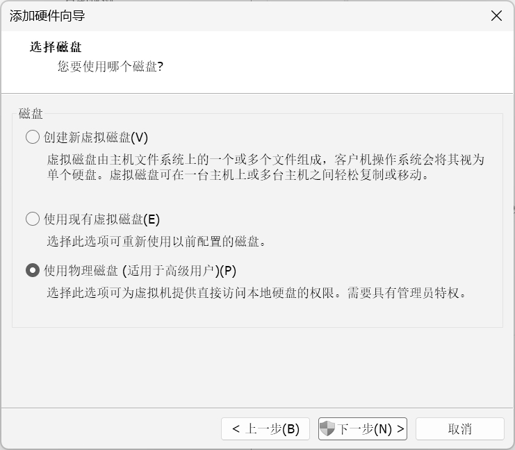点击“下一步”按钮,进入选择物理磁盘界面,这时需要选择U盘,把U盘添加为虚拟硬盘,如图2-60所示。