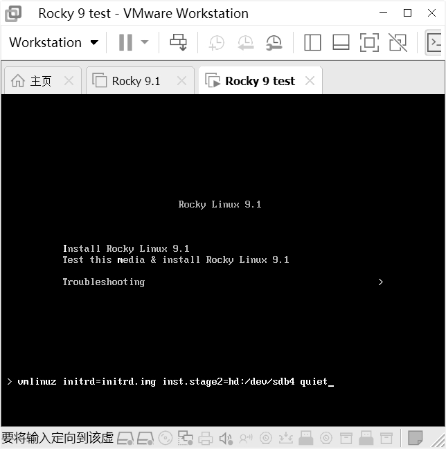 把此选项中的语句“vmlinuz initrd=initrd.img inst.stage2=hd:LABEL=Rocky-9-1-x86_64-dvd quiet”修改为“vmlinuz initrd=initrd.img inst.stage2=hd:/dev/sdb4 quiet”。不同的系统,U盘识别的硬盘分区设备文件名可能会有所不同,一般默认是/dev/sdb4,如图2-64所示。