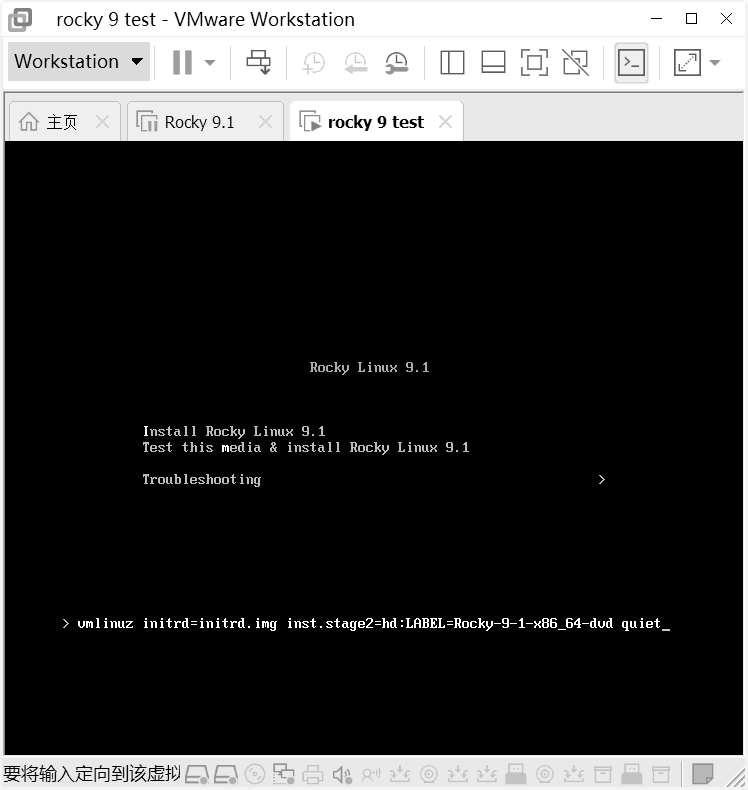 然后我们就能看到如图2-39所示的Linux安装选择列表界面了,在此界面需要通过箭头把光标移动到“Install Rocky Linux 9.x”图标上,按“Tab”键,会出现“启动内核选项”,如图2-63所示。