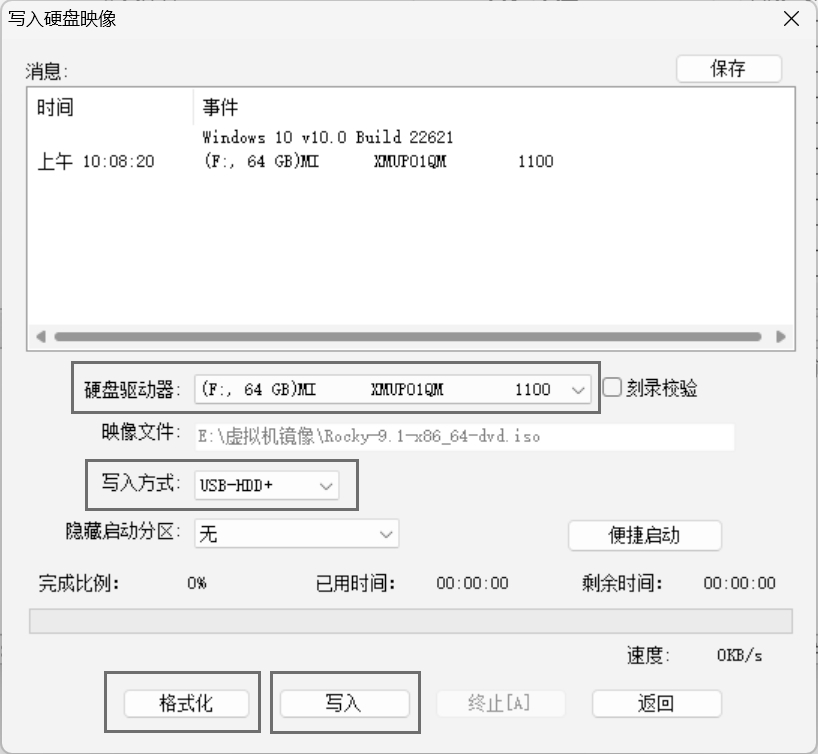在此界面中,首先需要选择“硬盘驱动器”,在下拉表单中选择你的U盘盘符,注意不要选错了,否则会丢失数据(方框标注位置)。在“写入方式”选项中,使用默认的“USB-HDD+”方式,这是绝大多数硬盘都识别的U盘启动方式(方框标注位置)。接下来记得先点击“格式化”按钮,格式化完成之后,再点击“写入”按钮(方框标注位置)。等待写入完成,U盘启动盘就制作完成了。