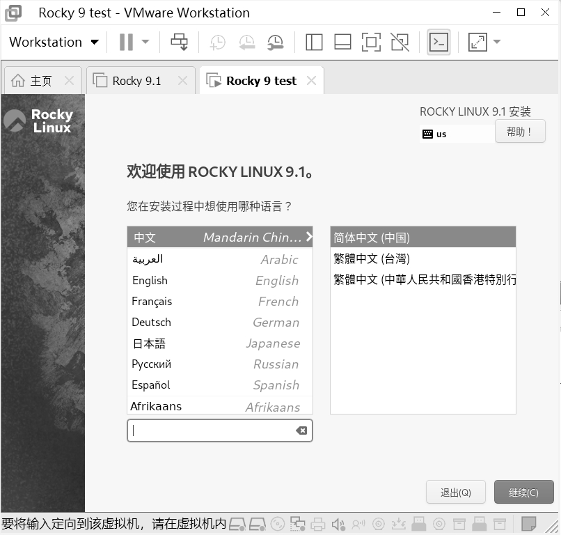 正常启动之后,系统会进入图形界面安装模式,首先进入的界面是安装语言选择界面,如图2-65所示。