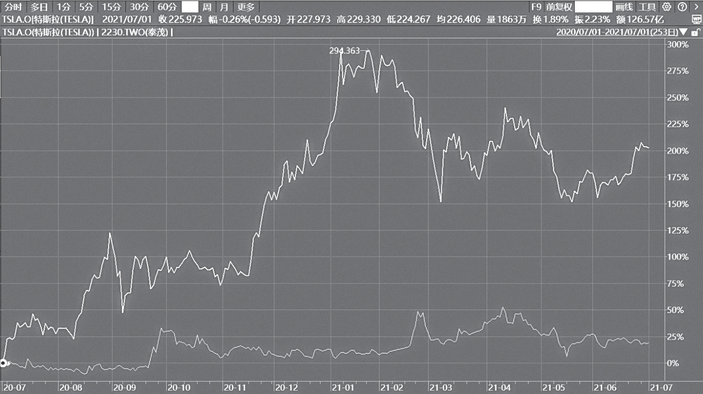 图1-12 2020年7月—2021年7月特斯拉和丰田股价走势对比