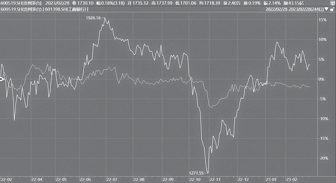 图1-11 2022年2月28日—2023年2月28日贵州茅台和工商银行股价走势对比