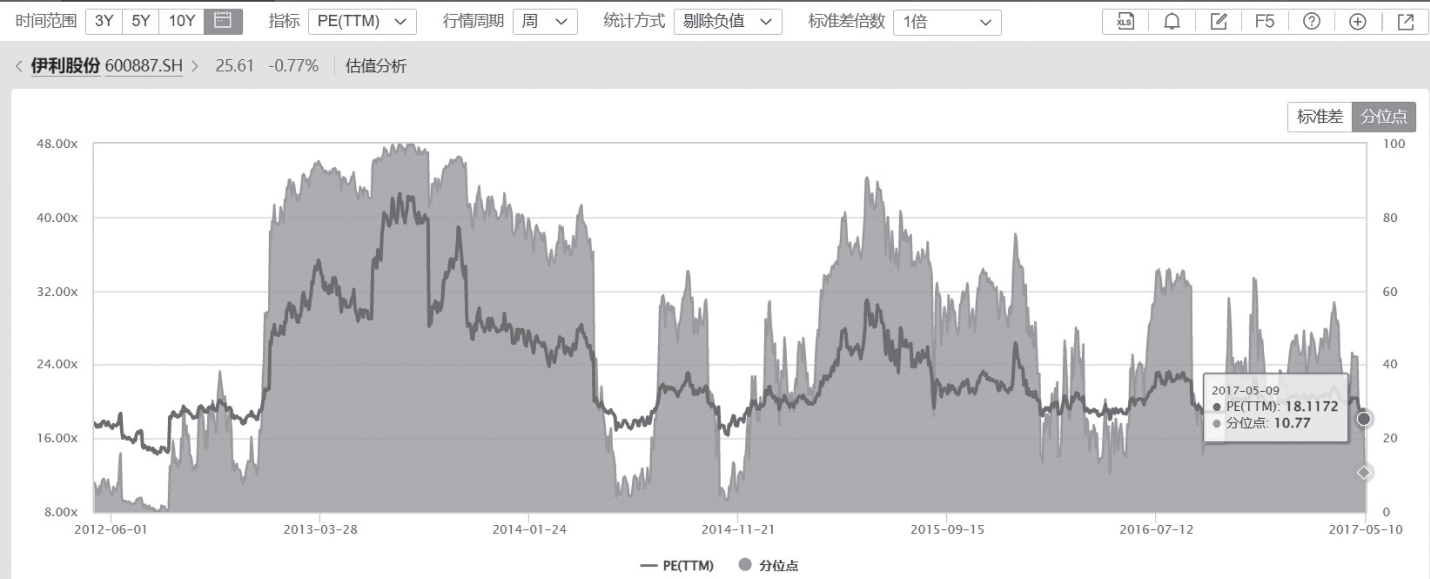 图1-15 2017年5月10日伊利股份过去5年市盈率分位数走势