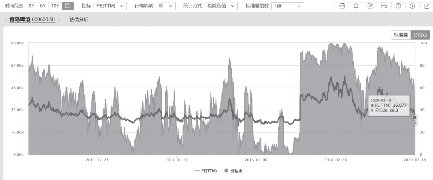图1-14 2020年3月19日青岛啤酒过去10年市盈率分位数走势