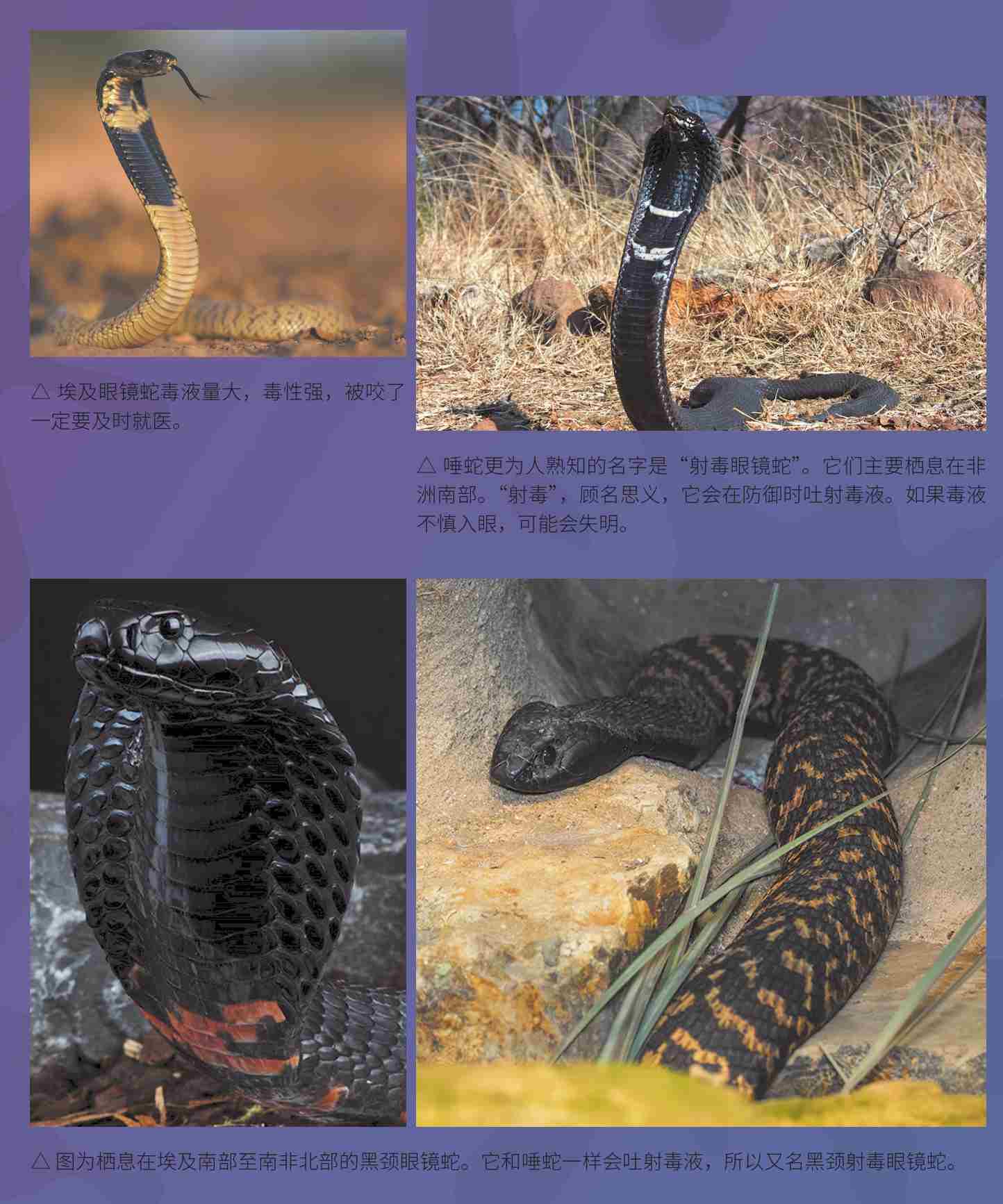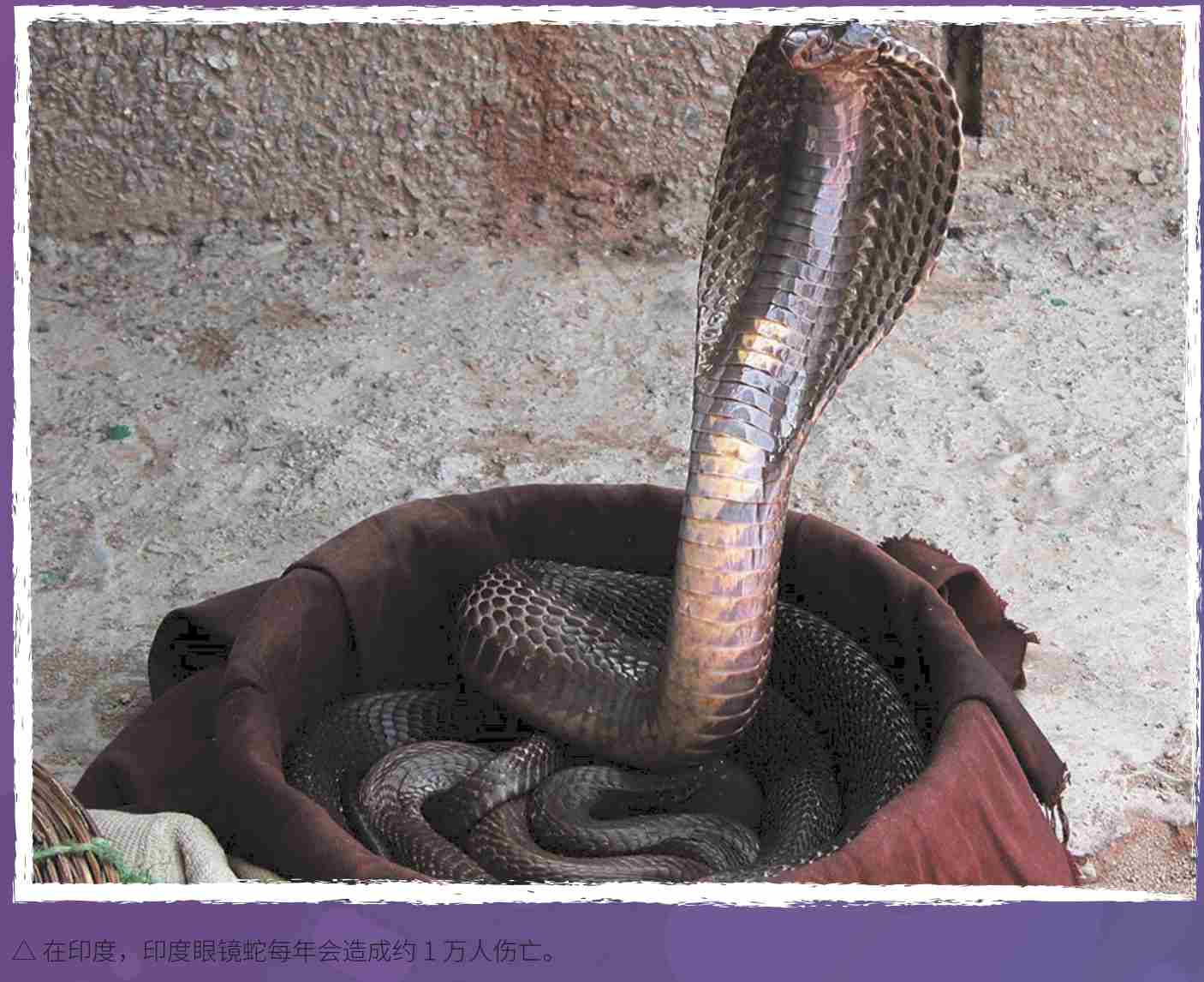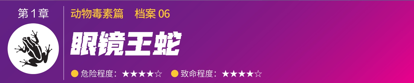 眼镜王蛇的毒素是神经毒素,弱于其他眼镜蛇科的蛇毒,但由于眼镜王蛇体形较大,一口咬下去注入的毒液量比其他眼镜蛇要多得多,所以非常危险。
