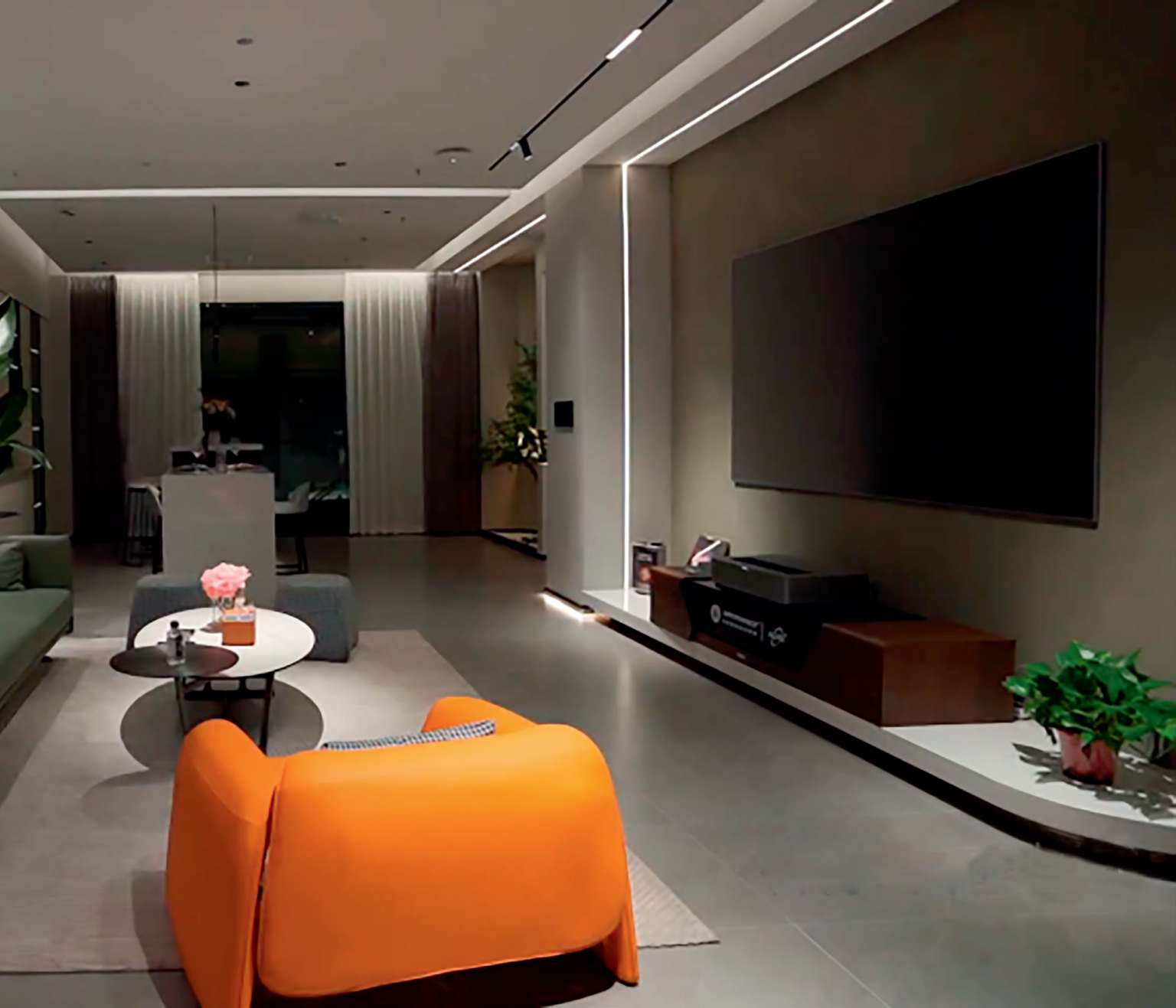 比如夜晚回家场景,智能门锁识别到第一个人到家,进家门时,玄关灯带会缓缓亮起。当换完鞋子,客餐厅的灯光也已经调整为合适的色温,窗帘缓缓关闭,电视机也自动打开,业主只需要走到沙发区坐下来即可。这一系列动作可以通过智能门锁一键触发完成,非常方便。