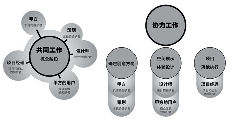 但在大型创意服务公司,团队不是固定的,会因项目类型及完成时间不同,分配不同人力资源组成团队去完成项目。我们要明确一个概念,团队组建的重点不是人多,而是要具备以下五种类型的拥护者:机构的拥护者(甲方)、主题的拥护者(策划师)、观众体验的拥护者(甲方的用户)、设计的拥护者(设计师)、项目和团队的拥护者(项目经理)。每种拥护者不一定是一个人,团队内的每一个人也可以身兼不同拥护者身份。