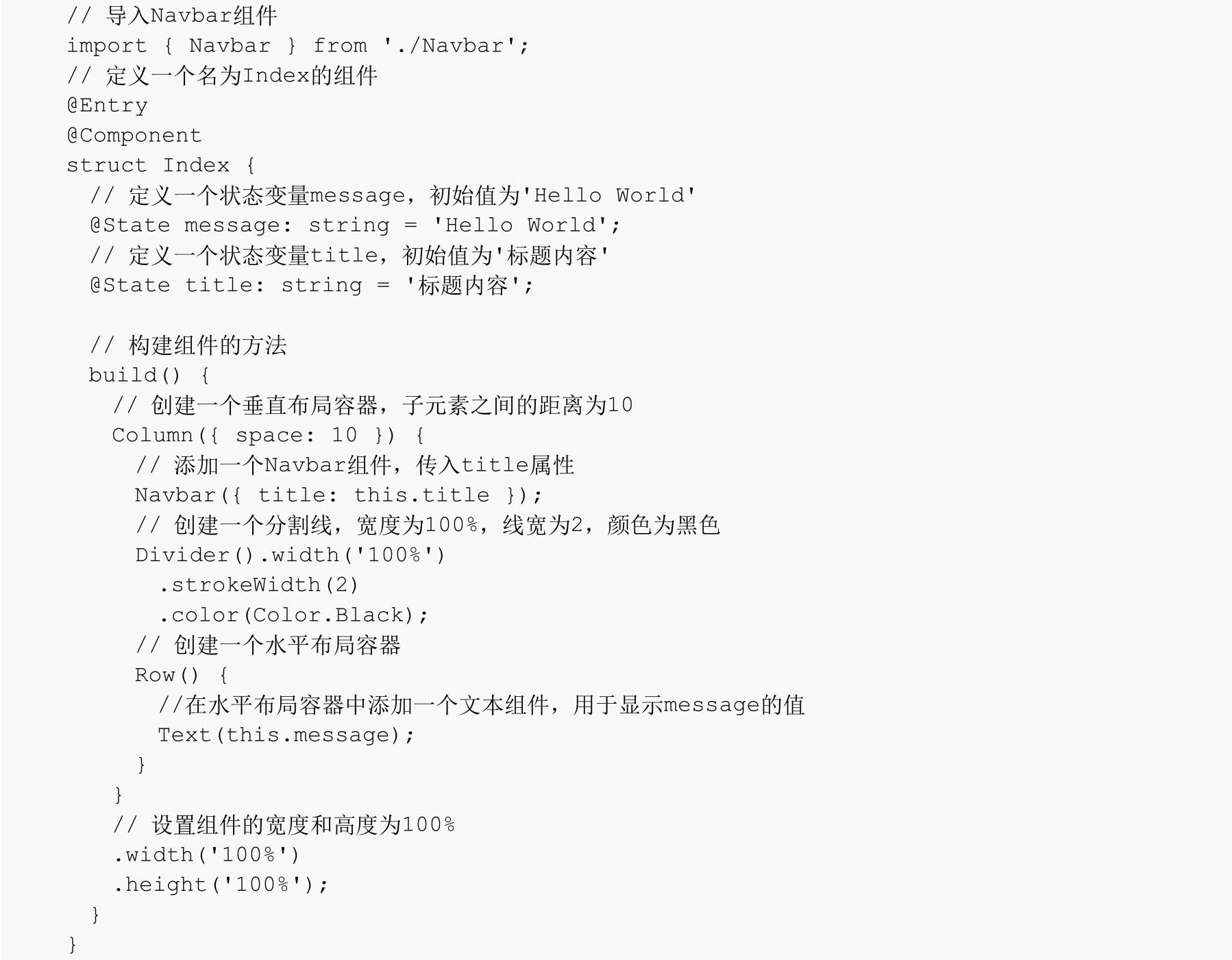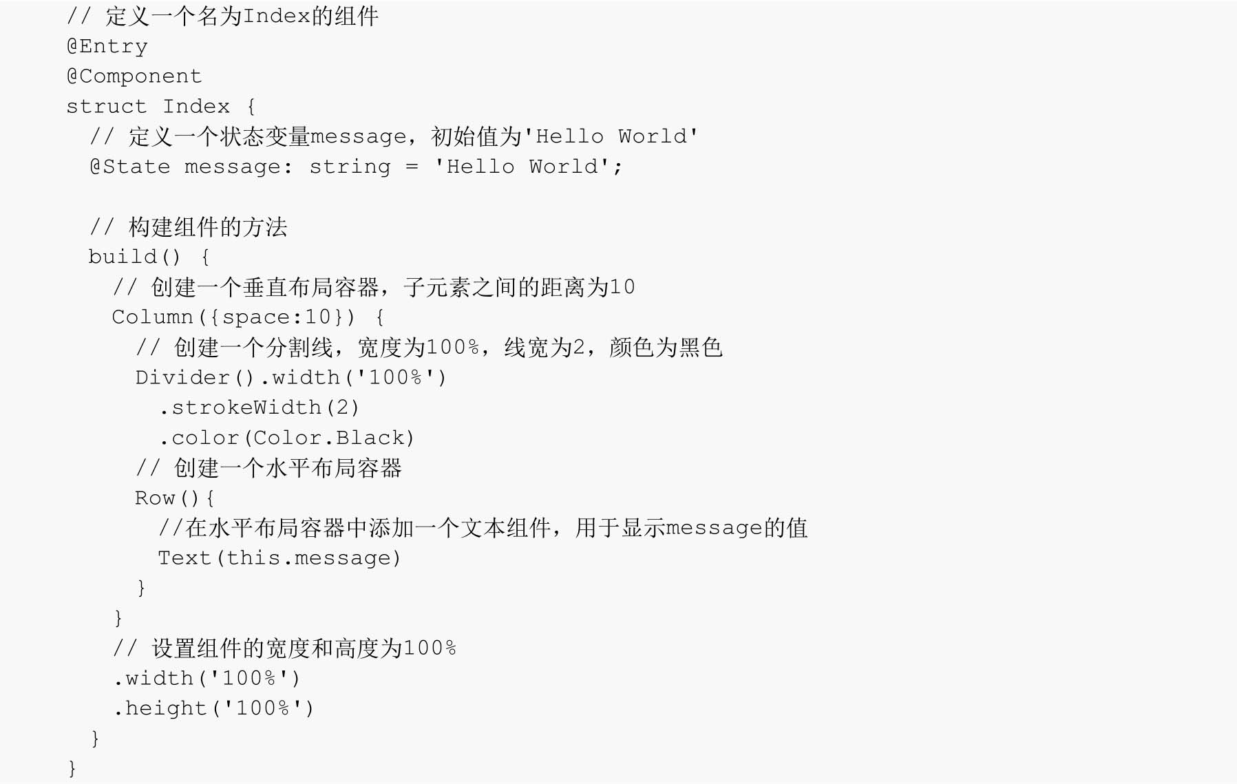 这段代码定义了一个名为HelloComponent的自定义组件。在这个例子中,我们使用了@Component注解来标记这是一个自定义组件,然后定义了一个状态变量message,其初始值为'Hello, World!'。build方法是组件的核心,它返回一个UI元素。在这个例子中,返回了一个Row组件,它包含一个Text组件。Text组件显示了message变量的值。当message变量的值发生变化时,UI会自动刷新以显示新的值。在这个例子中,我们将message的值更改为'Hello, ArkUI!',这将导致UI从显示'Hello, World!'变为显示'Hello,ArkUI!'。
