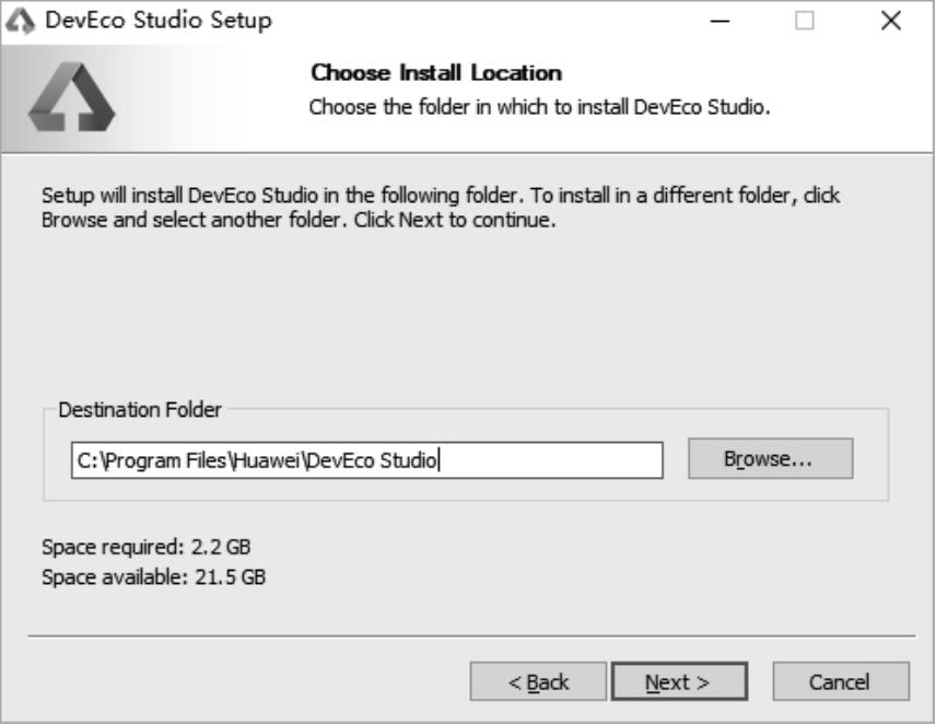 01 下载完成后,双击下载的deveco-studio-xxxx.exe,进入DevEco Studio安装向导。在打开的对话框中选择安装路径,默认安装于C:\Program Files路径下,也可以单击Browse...按钮指定其他安装路径;然后单击Next按钮,如图1-2所示。