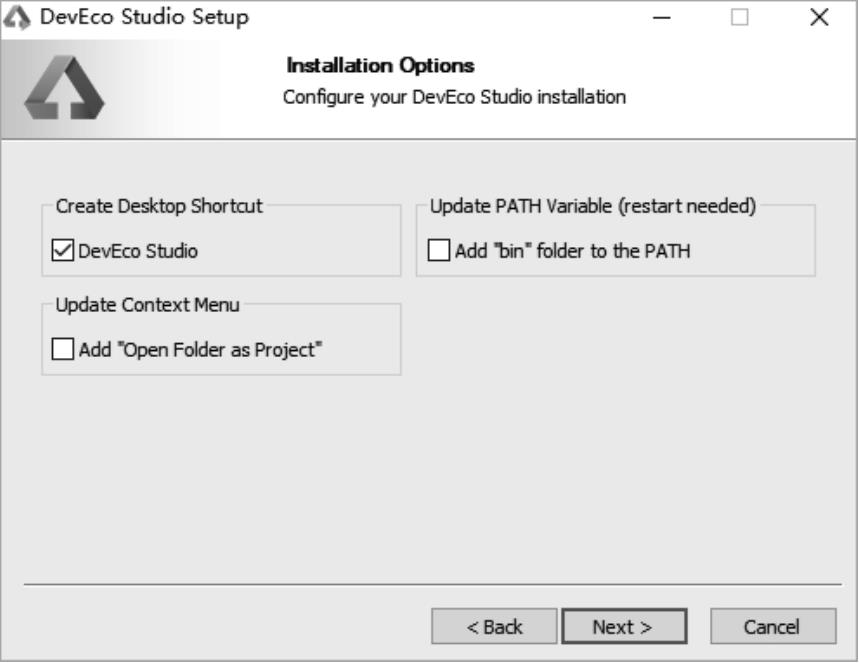 02 在安装选项界面勾选DevEco Studio复选框后,单击Next按钮,直至安装完成,如图1-3所示。