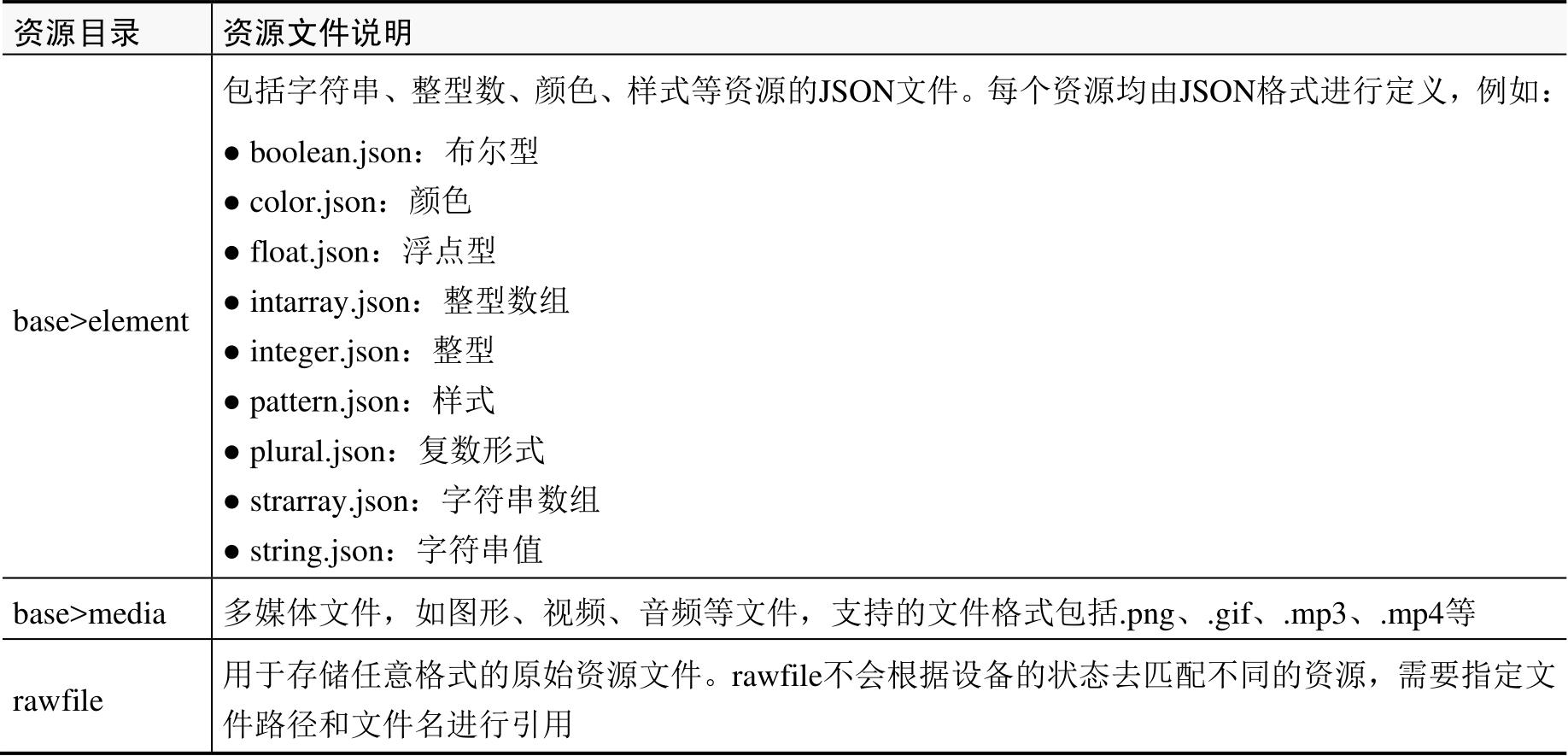 提示 在实际的开发过程中,我们通常会在media目录下存放一些静态的媒体资源;在element目录下存放开发过程中的一些公有变量,比如全局的字体颜色、背景颜色以及一些文本信息等;当使用Web组件加载页面时,会在rawfile目录下存放一些HTML页面,用于本地的加载。
