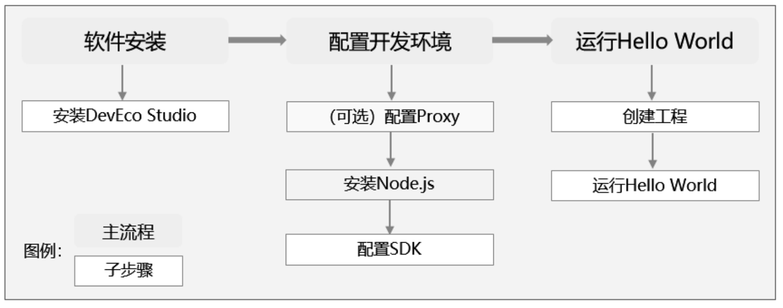 DevEco Studio支持Windows系统和macOS系统,在开发应用/服务前,需要配置应用/服务的开发环境。环境配置可参考如图1-1所示的流程。