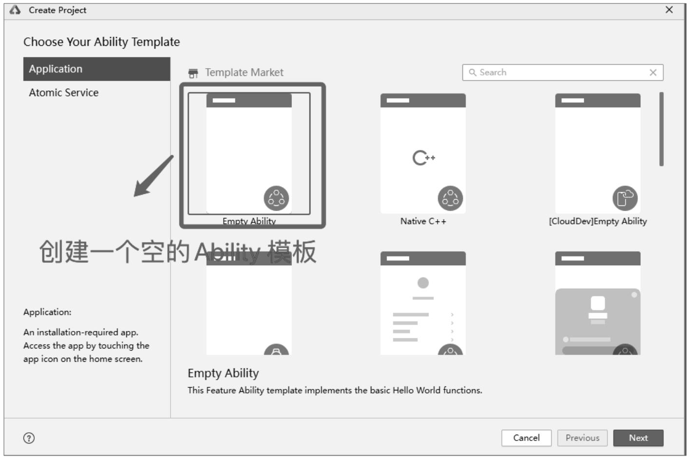 02 根据工程创建向导,选择创建Application或Atomic Service。选择Empty Ability模板,然后单击Next按钮,如图1-9所示。